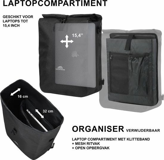 ? Gewatteerd 15 inch laptopcompartiment met extra netvakje en ritsvakje.