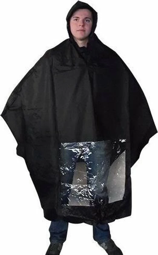 Deze fiets poncho is eenvoudig aan te trekken en aan de voorzijde voorzien van een transparante overlap. Deze zorgt ervoor dat de poncho over het stuur heen gehangen kan worden zonder dat daarbij de koplamp verduisterd. Aan de binnenzijde zijn twee elastieken lussen om de handen door te steken om opwaaien te voorkomen. De zwarte regenponcho fiets is vervaardigd uit waterdicht PVC en heeft drukknopen rondom de hals. Deze Sport-Plein regenponcho is in ??n maat leverbaar, “One-size-fits-all”.