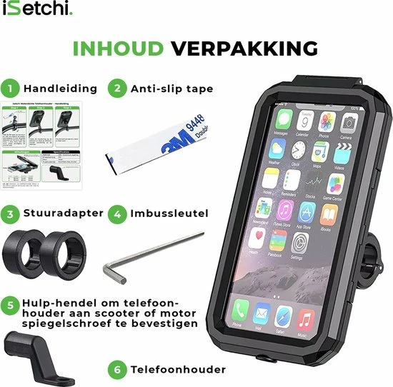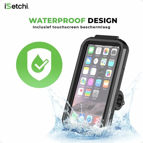De iSetchi waterdichte telefoonhouder voor op de fiets is eenvoudig te monteren. De metalen stuurstang zorgt voor een stevige fiets-stuur bevestiging en de meegeleverde spiegel-bevestiging zorgt ervoor dat de telefoonhouder op elke motor of scooter bevestigd kan worden. Plaats je Smartphone op de telefoonhouder, druk de drie klemmen vast en fietsen maar! Verder zorgt de vorm van de telefoonhouder ervoor dat de telefoon niet trilt tijdens het fietsen. De rubberen binnen-voering zorgt voor een anti-schock effect en een krasvrije telefoon.