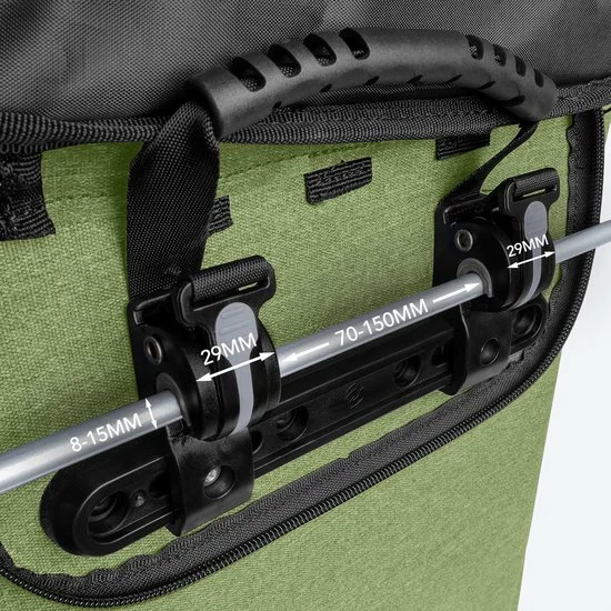 De LifeGoods Fietstas heeft verschillende opzetstukken. Zo past hij op elke bagagedrager, of het nu gewone fietsen of e-bikes zijn! Voor grote bagagedragers (15 mm doorsnee) heb je geen opzetstuk nodig. Gebruik het blauwe opzetstuk voor middelgrote bagagedragers (doorsnee van 11 mm). Het grijze opzetstuk werkt goed voor kleine bagagedragers (doorsnee van 8 mm).