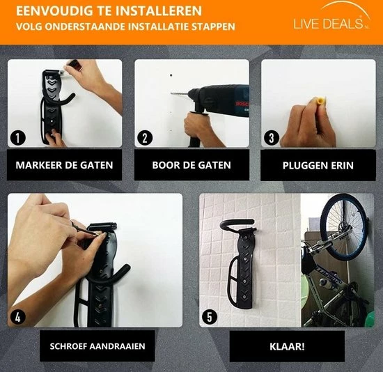 Het op de muur bevestigen van deze muurbeugels is vrij simpel en je hoeft geen ervaren klusser te zijn om dit te kunnen. Bij de afbeeldingen kun je een visuele montagehulp vinden. Dit fiets ophangsysteem wordt door ons geleverd met 2 setjes bevestigingsmaterialen. Deze bevatten in totaal 8 sterke schroeven en 8 pluggen. Het is wel belangrijk dat de fietshaak op een sterke muur bevestigd wordt. Het enige dat jij verder nog nodig hebt is een boor en een schroevendraaier.