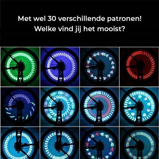 De spaakverlichting is waterdicht en heeft wel 30 verschillende patronen om uit te kiezen. Wat een keuze! Op elke snelheid die je fiets, zien deze schitterende patronen er anders uit. Iedereen moet natuurlijk goed kunnen zien hoe tof jouw fiets is! Daarnaast is het ook een goede manier om op te vallen in het verkeer als het donker is. Om het gebruik van de spaakverlichting ook handiger te maken heeft ons product een licht/bewegingssensor. Daardoor gaat het product automatisch aan in het donker of tijdens schemerig weer. Erg handig dus!