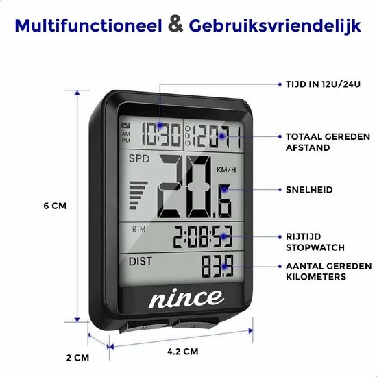 Met de compacte Nince fietscomputer heb jij altijd al je statistieken bij de hand. Deze uitgebreide draadloze fietscomputer is eenvoudig te monteren en beschikt over functies als snelheid, afstand, rijtijd, dagafstand, totaalafstand, klok, maximale snelheid, totale rijtijd en meer! De fiets computer is licht van gewicht, waterdicht en geschikt voor iedereen.