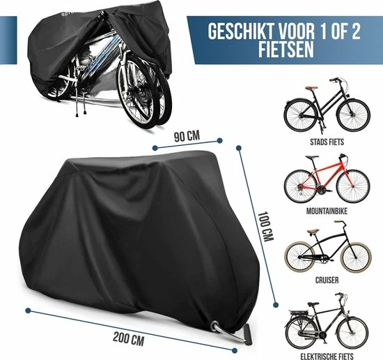 De hoes is 200 x 90 x 100 CM en beschikt over een elastische band. Geschikt voor nagenoeg elke fietsgrootte. De hoes past ook op fietsen met babyzitjes en fietstassen. Past op zowel 1 fiets als 2 fietsen naast elkaar.