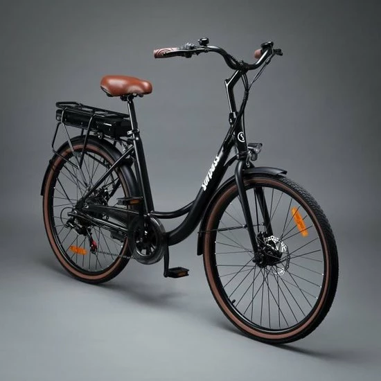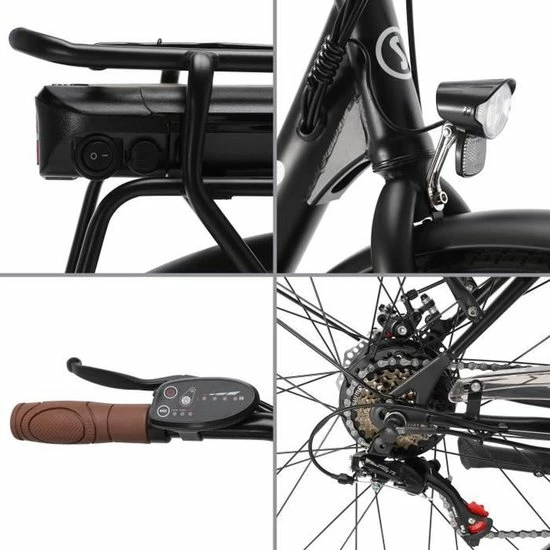 Elektrische stadsfiets 26 ” Surpass – ZWART stalen frame – 6 versnellingen met Shimano? derailleur – Schijfremmen – Motor achteraan 250 W – Veilige verwijderbare accu (2 sleutels) 10 Ah, bereik tot 40 km – 3 ondersteuningsmodi – voor- en achterlichten , bagagerek, bel, reflectoren, spatborden