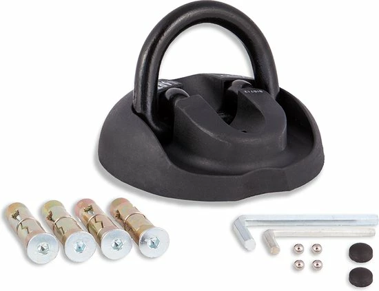 Zodra het muuranker aan de muur of vloer is bevestigd, kan deze makkelijk worden gebruikt, doordat de 14mm dikke beugel opklapbaar is en een groot gat (6 x 4,3 cm) heeft voor een dikke ketting of een dikke kabel.